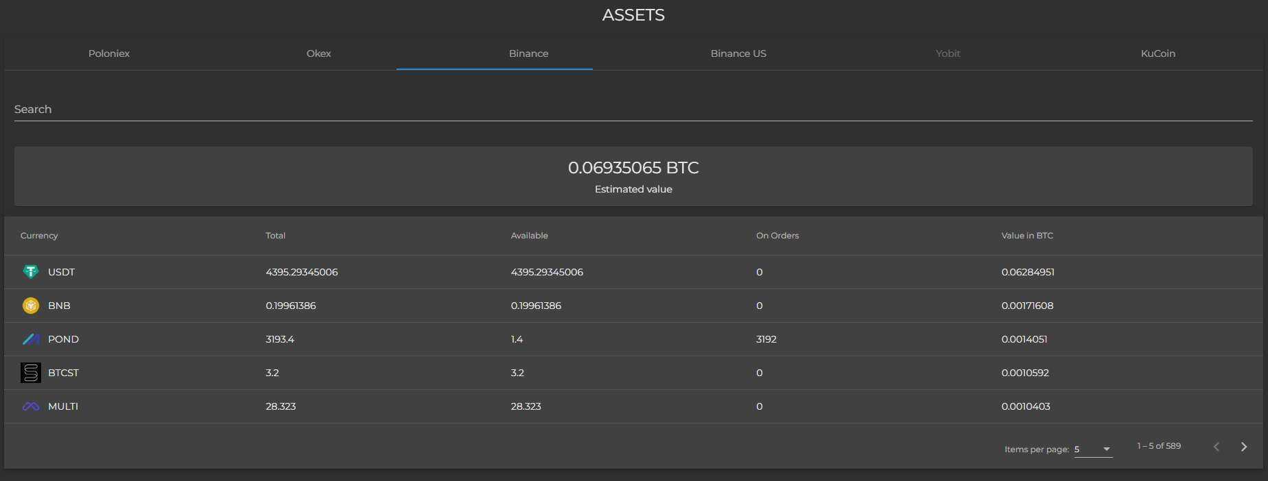 Assets page shows all your funds as well as estimated value in Bitcoin.