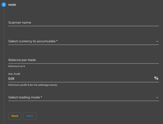 - Min. profit - minimum profit percent for the arbitrage events. Events with lower profit percent will not be executed. Min. profit value is 0.01.